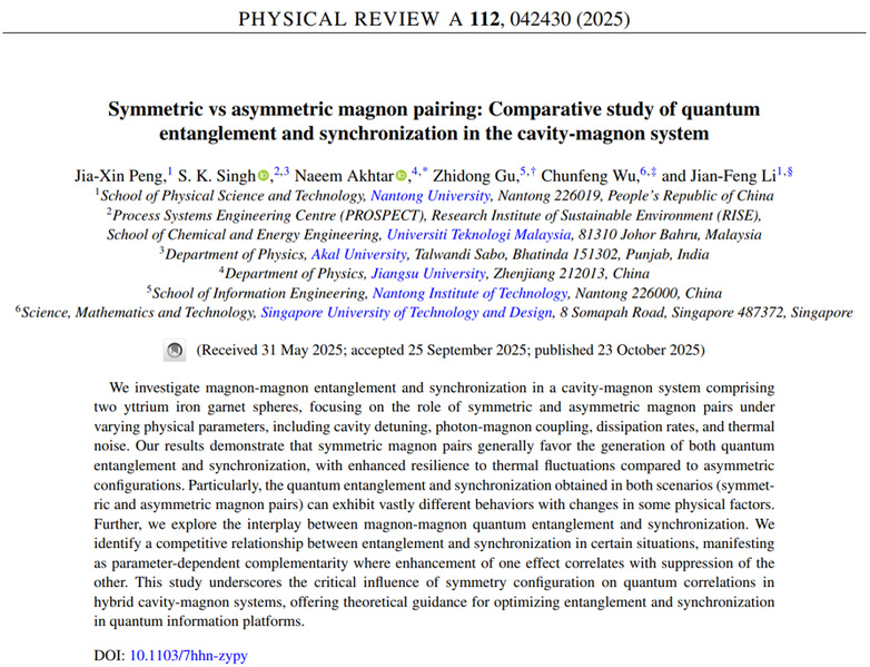 彭家鑫博士在《Physical Review A》发表最新研究成果