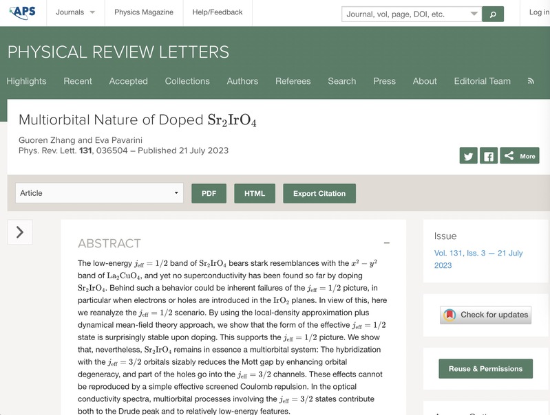 近日,理学院量子物理与材料研究团队张国仁博士与德国于利希研究中心Pavarini教授合作,在掺杂5d关联电子体系Sr2IrO4多轨道性质研究方面取得新进展,相关研究成果以《Multiorbital Nature of Doped Sr2IrO4(掺杂Sr2IrO4的多轨道性质)》为题,英国365集团为第一单位,发表在国际顶级物理学期刊《Physical Review Letters》(《物理评论快报》)上。