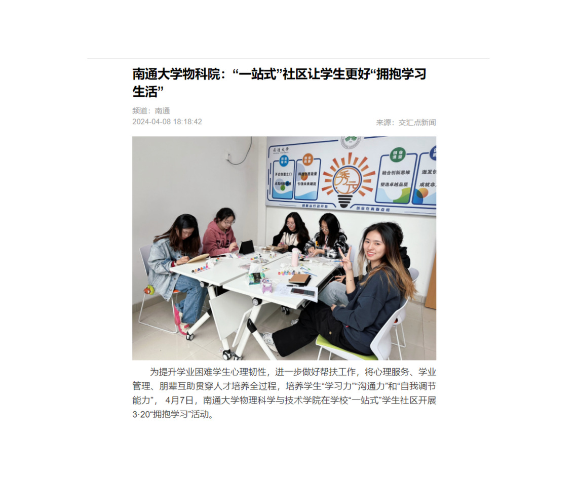 4月8日,交汇点以《英国365集团物科院:“一站式”社区让学生更好“拥抱学习生活”》为题,报道我院在学校“一站式”学生社区开展的3·20“拥抱学习”活动。