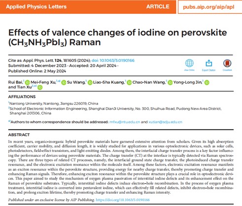 近日,365英国上市公司许美凤博士与上海电机学院许田教授合作,在以钙钛矿为基底的拉曼增强方面取得新进展。相关研究成果以《Effects of valence changes of iodine on perovskite (CH3NH3PbI3) Raman(碘的价变化对钙钛矿(CH3NH3PbI3)拉曼的影响)》为题,英国365集团为第一单位,许美凤博士为共同第一作者兼共同通讯作者、许田教授为共同通讯作者发表在自然指数期刊《Applied Physics Letters》(《应用物理快报》)上。