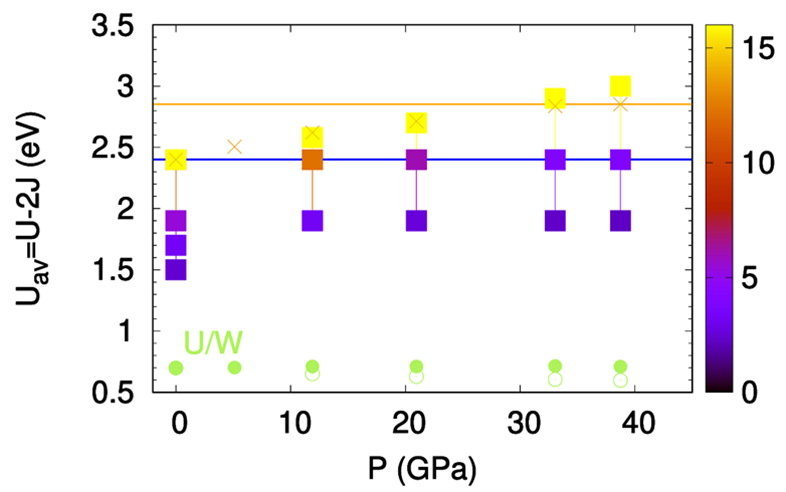 近期,新材料计算与结构设计研究团队的张国仁博士与伊朗Guilan大学Hadipour博士、德国于利希研究中心Pavarini教授合作,在5d关联电子体系Sr2IrO4高压下的Mott绝缘态研究方面取得新进展。他们的研究结果表明Sr2IrO4中电子间的屏蔽库仑相互作用(U)随压力的增大而增大,这一新奇现象和多轨道效应、IrO6八面体的旋转一起导致了该材料中屏蔽库仑相互作用和带宽W的比值U/W几乎不随压力的改变而改变,从而导致了Sr2IrO4在很高压力下仍然保持绝缘性。相关结果以“Nature of the high-pressure insulating state in Sr2IrO4: Mott picture”为题,以快报(Letter)的形式发表在Phys. Rev. B (Phys. Rev. B 111, L121101(2025))上。