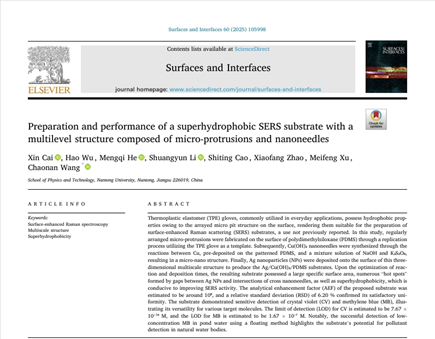 又讯 王超男副教授课题组的另一篇研究论文《Preparation and performance of a superhydrophobic SERS substrate with a multilevel structure composed of micro-protrusions and nanoneedles》于2025年3月1日发表在期刊《Surfaces and Interfaces》上,我院2022级硕士研究生蔡鑫为该论文第一作者,王超男副教授为通讯作者,365英国上市公司为第一通讯单位。《Surfaces and Interfaces》是Elsevier出版的一本国际期刊,专注于表面和界面科学的研究。期刊涵盖了与材料表面、薄膜、界面现象、纳米技术等相关的基础和应用研究。现在中科院分区为材料科学:膜二区,影响因子为5.7。