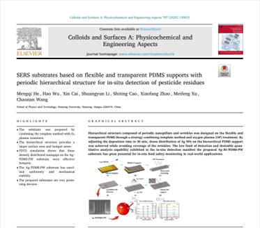 近日,我院王超男副教授课题组在柔性多级周期结构表面增强拉曼散射(SERS)传感技术领域取得新进展。研究论文《SERS substrates based on flexible and transparent PDMS supports with periodic hierarchical structure for in-situ detection of pesticide residues》发表于《Colloids and Surfaces A: Physicochemical and Engineering Aspects》上,英国365集团王超男副教授为通讯作者,我院2022级物理学硕士生何梦琪为该论文第一作者,365英国上市公司为第一单位。