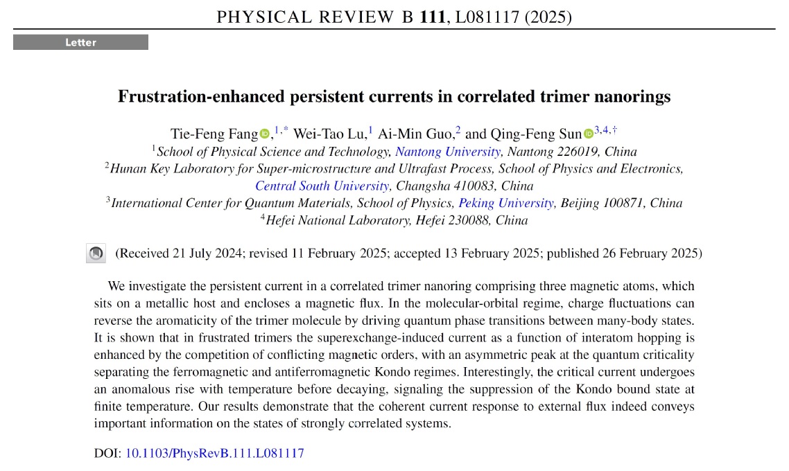 近期,房铁峰教授团队与合作者在分子纳米环的持续电流研究方面取得进展,相关成果以“Frustration-enhanced persistent currents in correlated trimer nanorings”为题目,以快报(Letter)形式发表在《Physical Review B》上。