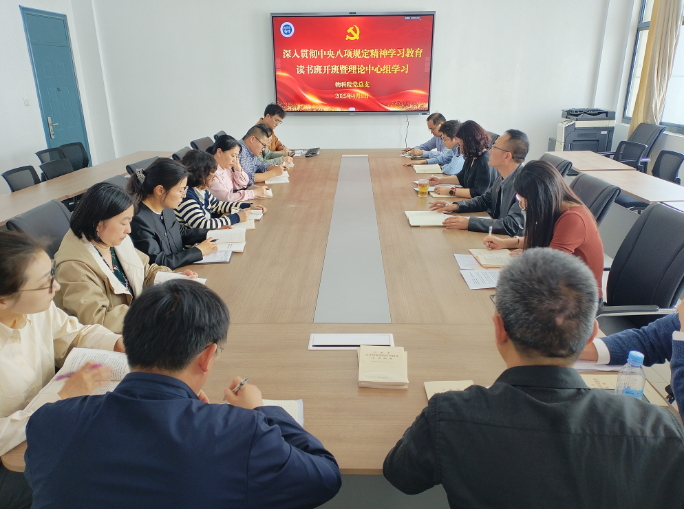 4月9日,物科院举行深入贯彻中央八项规定精神学习教育专题读书班开班式暨党党总支理论学习中心组学习会。学院党总支书记徐凌作开班动员讲话。院长仲崇贵领学《中央八项规定》精神的相关内容,学院党总支宣传委员刘勇解读《物科院深入贯彻中央八项规定精神学习教育专题读书班实施方案》。