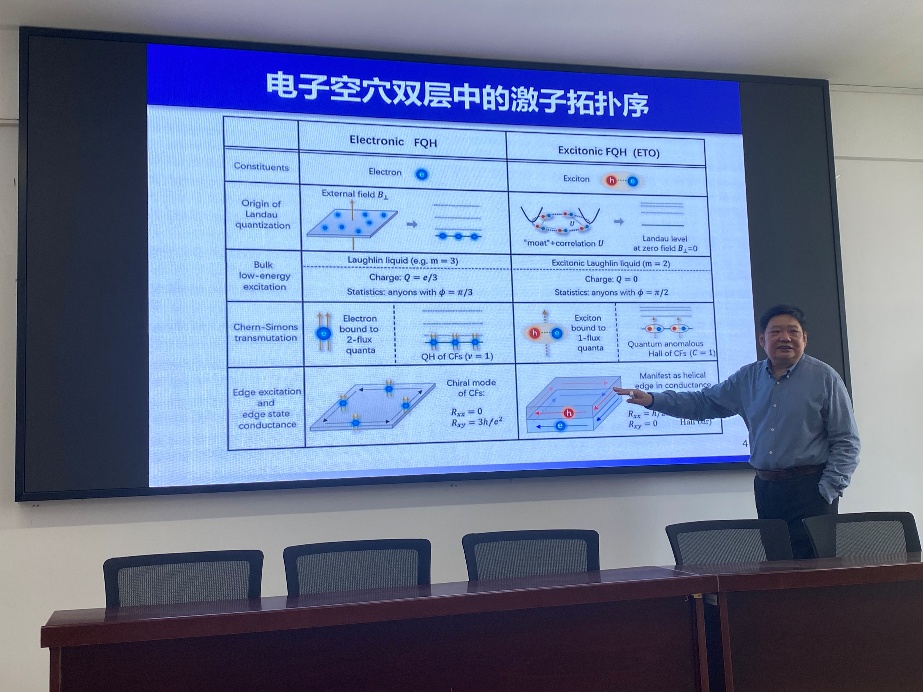 王伯根首先从电子-空穴不平衡的双层体系阻挫效应切入,阐释该效应通过诱导强量子涨落,可形成比传统FFLO态更稳定且具备长程量子纠缠特性的分数量子霍尔态—激子拓扑序。随后,他重点分析了零磁场条件下激子阻挫导致的体能隙、手征激子边缘态及其输运现象的突破性实验进展,相关成果为激子体系中分数量子霍尔态的存在提供了关键证据。互动环节中,与会师生围绕硬核玻色子模型、量子霍尔效应等前沿议题与王伯根展开深入交流,现场学术氛围热烈,参会师生表示深受启发。