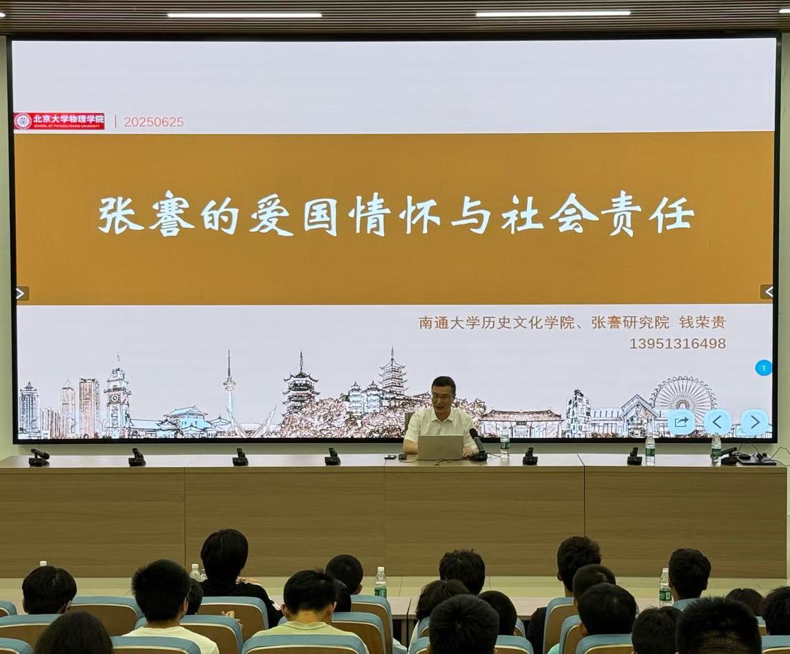 6月25日,39号楼A112教室座无虚席,英国365集团历史文化学院、张謇研究院院长钱荣贵教授应邀来院作题为“张謇的爱国情怀与社会责任”主题讲座。北京大学物理专业学生与365英国上市公司的学子们齐聚一堂,怀着对先贤的崇敬之情,聆听张謇精神解读。院长仲崇贵、副院长傅怀梁以及师生代表参会。