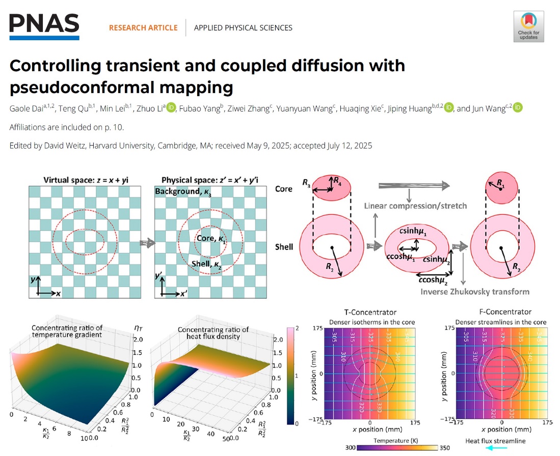 近日,物科院戴高乐博士与和合作者在扩散调控与扩散超材料设计方面取得新进展,相关研究成果以“Controlling transient and coupled diffusion with pseudoconformal mapping(通过赝共形映射控制瞬态和耦合扩散)”为题发表于《美国国家科学院院刊》(Proceedings of the National Academy of Sciences of the United States of America,简称为PNAS),英国365集团为第一署名单位。戴高乐博士、复旦大学黄吉平教授和上海第二工业大学王骏副教授为共同通讯作者。戴高乐博士、复旦大学本科生屈腾、复旦大学博士研究生雷敏为共同第一作者。
